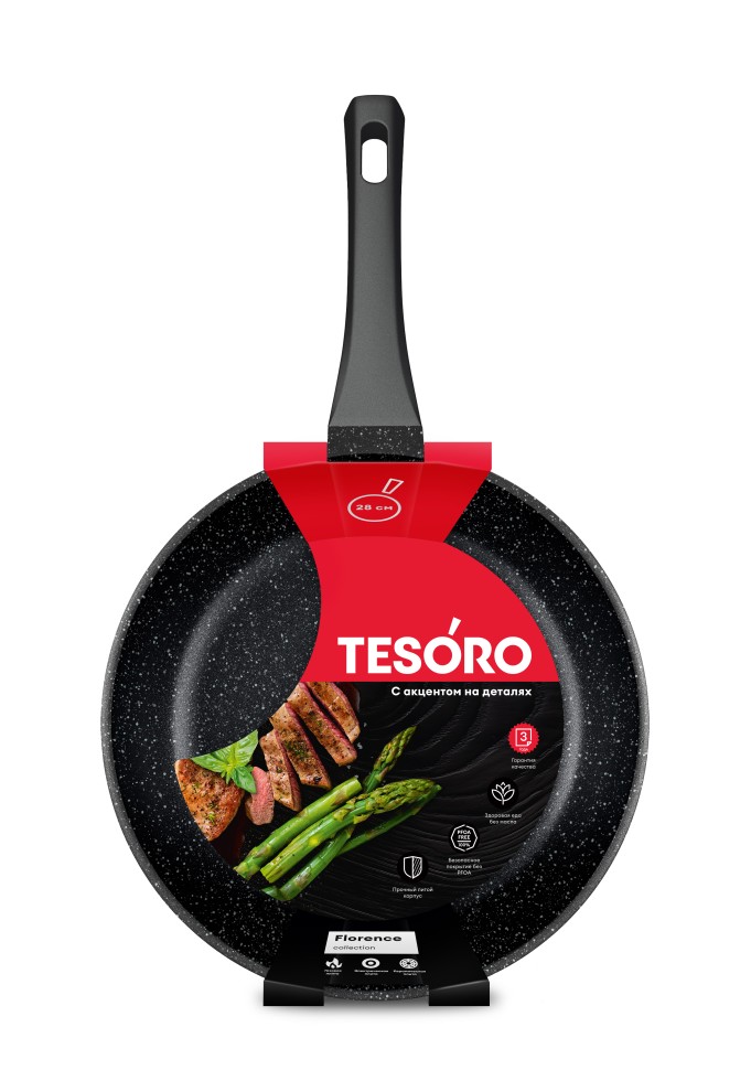 ниверсальная сковорода из литого алюминия с премиальным антипригарным покрытием, диаметр 28 см. Сковороды «Tesóro» разработаны командой профессиональных инженеров и дизайнеров, созданы для ценителей баланса красоты, функциональности и эстетики.